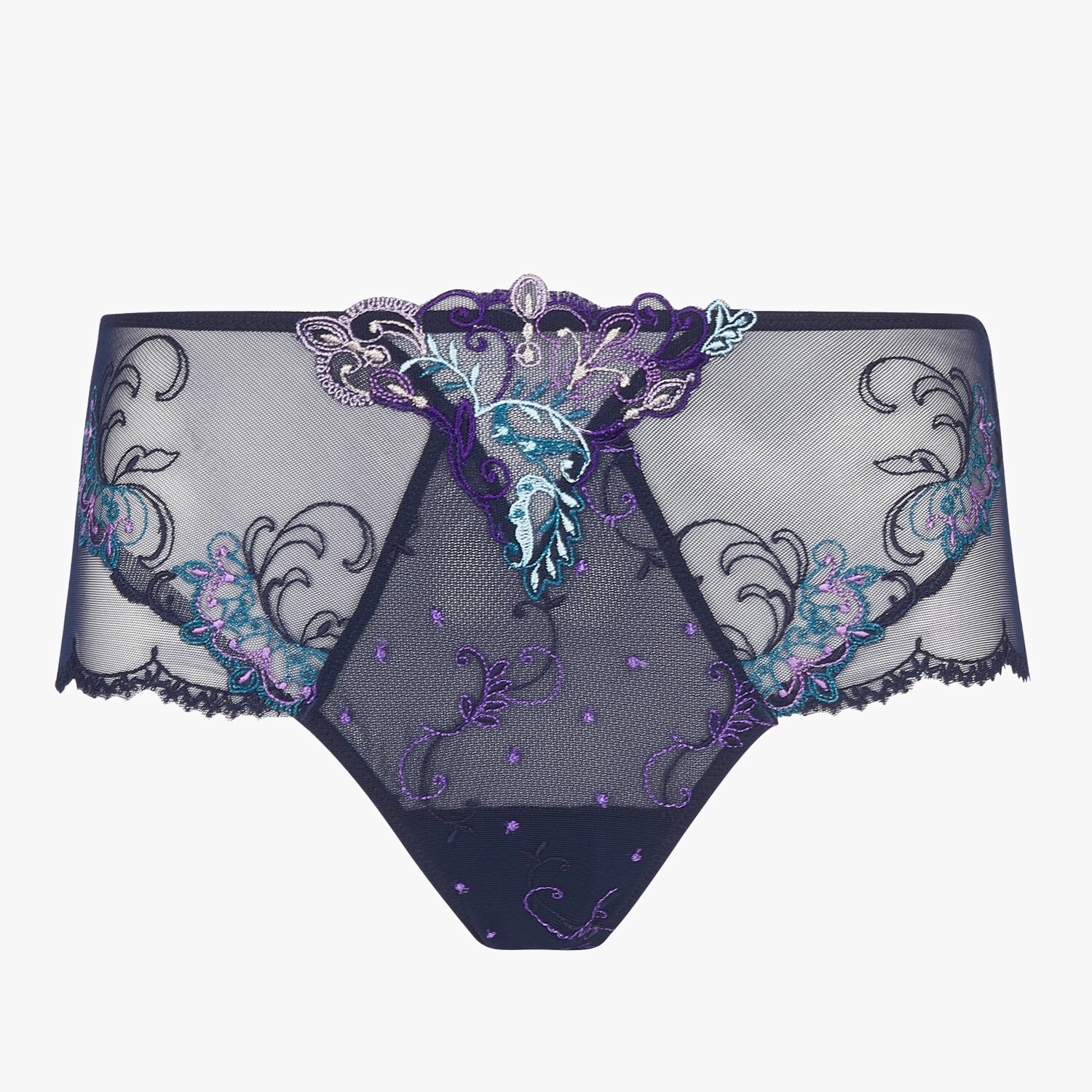 Lise Charmel Deesse Desirs šortky fialovozelená výšivka na tmavě modré